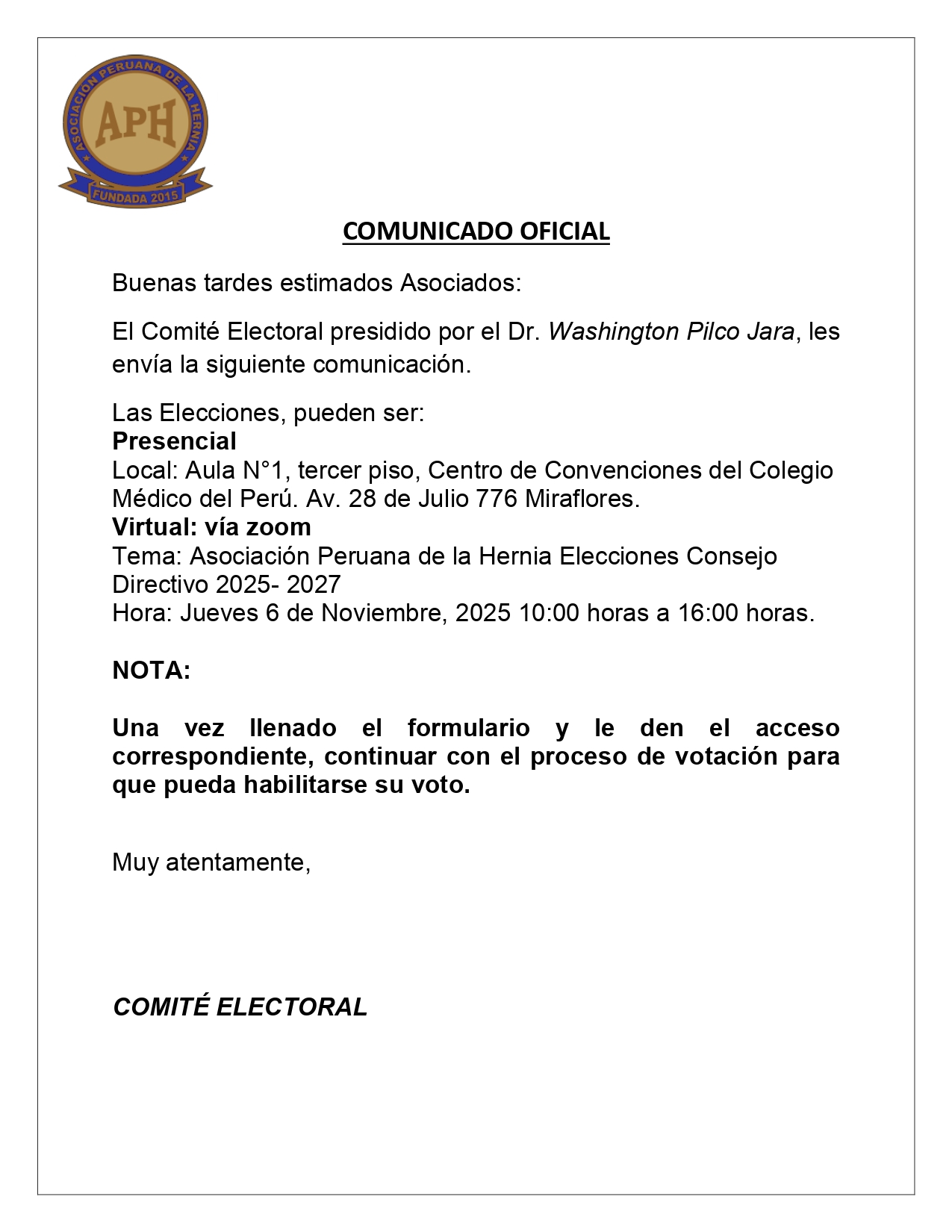 - Tema: Asociación peruana de la Hernia Elecciones Consejo Directivo 2025- 2027